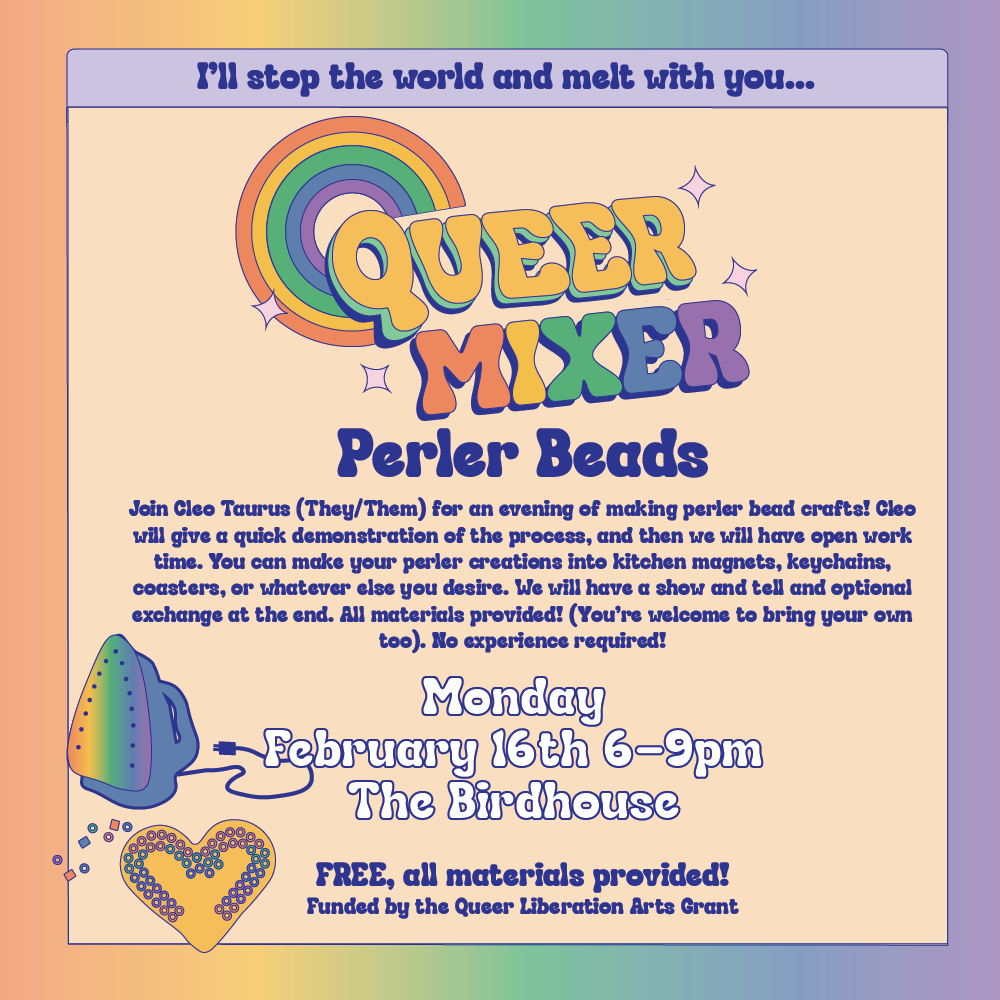 Cleo Taurus presents Queer Mixer Perler Beads on Monday February 16th from 6-9pm at Birdhouse (400 N. 4th Ave). Join us for for an evening of making perler bead crafts! Cleo will give a quick demonstration of the process, and then we will have open work time. You can make your perler creations into kitchen magnets, keychains, coasters, or whatever else you desire. We will have a show and tell and optional exchange at the end. All materials provided! (You’re welcome to bring your own too). No experience required!